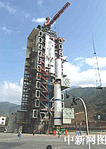 圖:"長征二號(hào)丙"改進(jìn)型運(yùn)載火箭一、二級(jí)吊裝上發(fā)射塔架(12月30日 03:47)