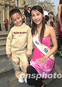 一位澳門小朋友在大三巴與一位佳麗合影。作者:李剛