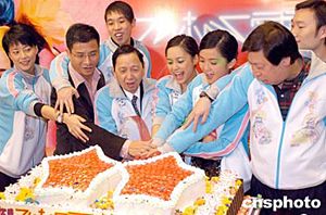 演唱會結(jié)束后,Twins與唱片公司高層吳雨及演唱會主辦機構(gòu)老板張耀榮等人舉行祝捷會切蛋糕。作者:鄧慶樂