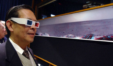 1月5日,在美國加利福尼亞州帕薩迪納的宇航局噴氣推進(jìn)實(shí)驗(yàn)室,彼特博士配戴著立體眼鏡觀看“勇氣”號(hào)火星探測器搭載的照相機(jī)拍攝的三維圖像。