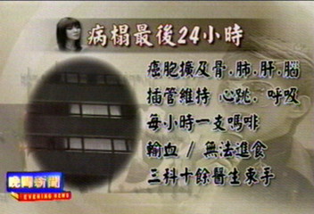 根據(jù)醫(yī)生的描述,由于癌細胞四處擴散,無法自主呼吸,只能依賴儀器維持梅姑的心跳和呼吸,再加上癌癥導致骨盆疼痛和下體出血,彌留階段的梅姑持續(xù)輸血,每小時都得打嗎啡止痛。養(yǎng)和醫(yī)院出動腫瘤科、呼吸科以及放射科3科10多名醫(yī)生,仍然束手無策。