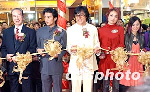 歌影紅星謝霆鋒、成龍、容祖兒、人氣組合Twins及名人何鴻燊等人1月9日在香港銅鑼灣親臨英皇鐘表珠寶分店開(kāi)幕禮,并舉行剪彩儀式。中新社記者:鄧慶樂(lè)
