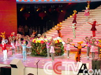 2004年春節(jié)晚會總導演袁德旺提出以“祝!睘榇和碇黝}!白8!钡闹黝}不僅在舞美設計上得到了體現(xiàn),在晚會現(xiàn)場的一面墻上,還有一塊巨幅的“!弊謭D。44個由不同的字體書寫的福字環(huán)繞著中間的中央電視臺的標志圖,祝福的主題躍然而出。