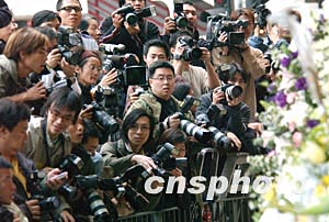 香港著名藝人梅艷芳喪禮于元月十一日設(shè)靈公祭,在香港殯儀館前大批記者報道有關(guān)梅艷芳喪禮新聞。中新社記者:錢興強(qiáng)