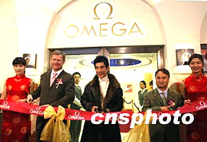 瑞士著名手表品牌歐米茄旗艦店1月13日在北京東方君悅酒店商業(yè)區(qū)開業(yè),歐米茄中國及香港區(qū)副總裁盧克勤先生(左二)與歐米茄形象大使任賢齊(中)到場剪彩。中新社記者:趙振清