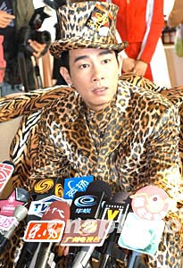 歌星陳小春1月14日在香港舉行《陳小春夜生活演唱會》記者會,為配合演唱會主題,陳小春一身獸皮衣飾出席,加上衣著性感舞蹈員為演唱會記者會增添活色生香。作者:鄧慶樂