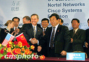 由中國(guó)信息產(chǎn)業(yè)部副部長(zhǎng)婁勤儉帶隊(duì),由中國(guó)電信、中國(guó)移動(dòng)、中國(guó)聯(lián)通、北大方正以及聯(lián)想電腦等企業(yè)組成的電子信息產(chǎn)品采購(gòu)團(tuán)于美國(guó)時(shí)間十一日到達(dá)美國(guó),媒體報(bào)道,這次簽約的合同達(dá)二十三億多美元。
