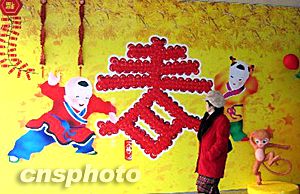 2004年1月14日,行人走過上海街頭一幅“喜娃報(bào)春”的年畫前。中國的傳統(tǒng)佳節(jié)——春節(jié)就要到來,申城街頭隨處可見傳統(tǒng)的中國年畫。井韋 攝
