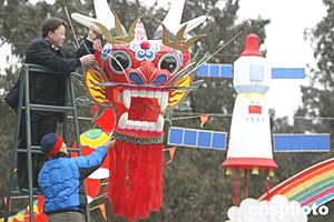 工作人員一月十七日在北京勞動人民文化宮安裝調試巨龍造型的風箏和神州飛船造型的彩燈。來自濰坊的風箏與天津的彩燈春節(jié)期間一同亮相太廟民俗文化游園會,扮靚節(jié)日的京城。中新社記者:毛建軍