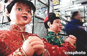 云集中國各地五百多家商戶的北京天外天小商品批發(fā)市場內,一對童男童女玩偶在中國農歷甲申猴年來臨前夕向來往客商拜賀新年,增添濃濃節(jié)日氣氛。中新社記者:鄒憲