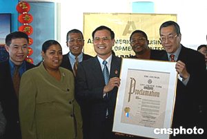 亞美商業(yè)發(fā)展中心和紐約市合作二十日舉行紐約帝國(guó)大廈亮燈儀式,慶祝中國(guó)農(nóng)歷新春,紐約州、市官員等都前往祝賀。圖為中國(guó)駐紐約總領(lǐng)事劉碧偉(右三)和亞美商業(yè)發(fā)展中心總裁王章華(右一)共同接受紐約市議員的祝賀。作者:趙海燕