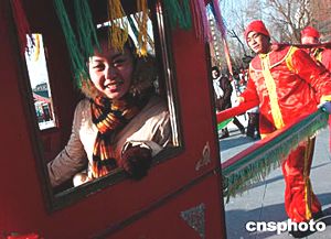 中國農(nóng)歷大年初一,北京各大公園別具特色的廟會活動紅紅火火地開始了,大觀園內(nèi)仿照中國古代新娘出嫁坐花轎的游樂項目,引來許多平日坐慣轎車的現(xiàn)代女性,鉆進花轎品嘗舊時“新娘”滋味。中新社記者:王麗南