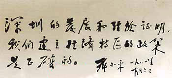 鄧小平散步回來,一進(jìn)1號(hào)樓,就坐在門左邊的沙發(fā)上休息。李天增將深圳寫好的、作參考的紙條拿給小平同志,紙條上擬寫了幾條:深圳特區(qū)報(bào)、深圳青年報(bào)、大鵬展翅,這張紙條曾給吳南生同志看過,他又加了一條:堅(jiān)持改革開放,繼續(xù)辦好特區(qū)。鄧小平一看,說:“要寫這么多呀?”李天增說:“這是深圳同志拿來的,不受這個(gè)限制,您想寫什么就寫什么。”鄧小平隨手丟開紙條,胸有成竹地走向辦公臺(tái),拿起了筆,才寫了幾個(gè)字,粘住了。李天增暗罵自己笨,房間里有暖氣,蘸在毛筆上的墨粘結(jié)了。他趕緊添水研墨后,換張紙,鄧小平重新提起了筆。這一次,他一揮而就:“深圳的發(fā)展和經(jīng)驗(yàn)證明,我們建立經(jīng)濟(jì)特區(qū)的政策是正確的!