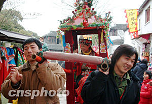 水鄉(xiāng)古鎮(zhèn)同里春節(jié)期間推出坐花轎過(guò)三橋活動(dòng),增加了節(jié)日氣氛,眾多游客興致勃勃地坐上了四人抬的大花轎,一邊傾聽(tīng)著嗩吶等古樂(lè)的伴奏聲,一邊觀賞著水鄉(xiāng)古鎮(zhèn)的景色。作者:蔣振江
