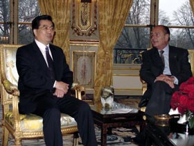 胡錦濤在機(jī)場出席了希拉克主持的隆重歡迎儀式后直接來到愛麗舍宮,這是兩國元首此次訪問期間的首次會(huì)談。