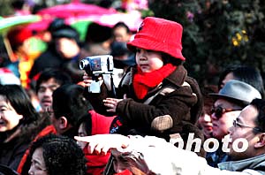 在春節(jié)廟會上,北京一位小女孩騎在家長的肩上用數(shù)碼攝影機(jī)拍攝節(jié)日景象。數(shù)碼科技的發(fā)展,為人們的生活增添了無窮樂趣。中新社記者:王麗南