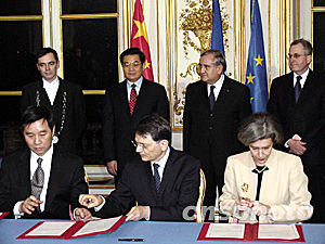 中新網(wǎng)巴黎1月28日電(記者蔚中)二十八日晚,巴黎馬提翁宮——法國總理府內(nèi)燈火通明,中、法兩國在此簽訂了九項(xiàng)合作協(xié)議。正在法國訪問的中國國家主席胡錦濤和法國總理拉法蘭出席了簽字儀式。