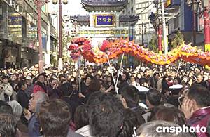 以著名的日本橫濱中華街為終點(diǎn)站的“未來(lái)港”地鐵新線二月一日正式開(kāi)通,橫濱華僑在街頭以傳統(tǒng)舞龍慶賀這個(gè)著名華埠有史以來(lái)首次開(kāi)通地鐵。作者:王健