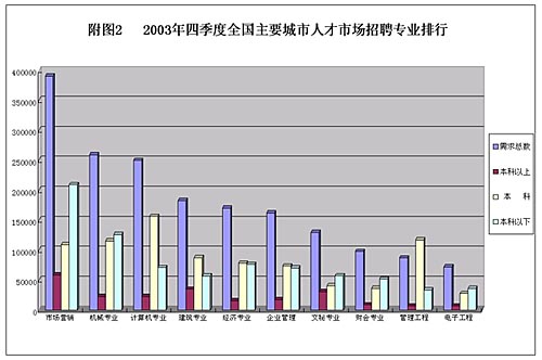中新網(wǎng)2月4日電 2003年四季度全國人才市場供求信息顯示,全國人才市場人才供需兩旺,但各專業(yè)間供求形勢差異較大。市場營銷、機械、計算機、建筑等專業(yè)依然是人才市場的熱門專業(yè),職位需求量保持旺盛。