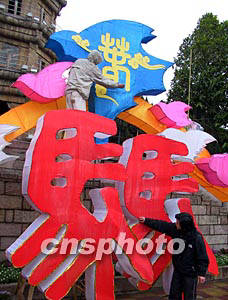 二名馬祖制燈藝人四日冒春雨在馬尾元宵節(jié)燈會會場的馬祖展區(qū)內(nèi),為一盞“兩馬烘春”大型主題花燈裝點。作者:劉可耕
