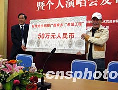 二月九日,祖籍廣西天等縣的臺(tái)灣歌手趙傳(左)在南寧市捐資五十萬元人民幣,幫助天等縣龍茗中學(xué)改善教學(xué)環(huán)境。作者:唐安軍