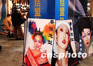 十三日,中國影樓、婚紗用品展在北京舉行,一銷售假發(fā)的參展商推出美侖美奐的造型圖片吸引商家加盟。中新社記者:王麗南