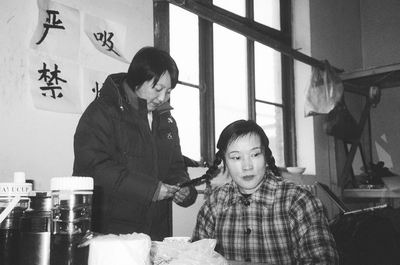 化妝間里,她正在梳辮子,一邊和聞訊過來看她的北影老演員樊姨聊著。在這部戲里,她演的艾蓮是右派的老婆、4個孩子的媽。穿上花棉襖,在《281封信》里時尚干練的老總一下子變成了上世紀70年代樸素內(nèi)向的母親。劉曉慶很喜歡這個造型,這讓她想起了以前拍攝《許茂和他的女兒們》、《芙蓉鎮(zhèn)》等的情景。其實她以前沒少演底層人物,只是后來看多了她的古裝美人,一時竟讓人對她的這種造型有些不信。這是她進組的第一天,5點就起床出門,估計得拍到天黑。導演對她和李幼斌的對手戲很滿意,進度順利。