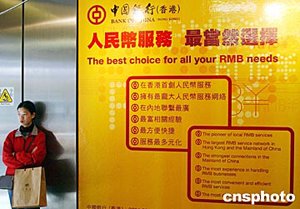 日前,中國人民銀行行長周小川來香港參加國際結(jié)算銀行會議時表示,繼人民幣信用卡已在香港使用后,香港銀行將在二月二十五日起,可以開辦個人人民幣業(yè)務(wù),包括人民幣存款和匯款業(yè)務(wù)。近日,中銀香港已在報章等媒體展開人民幣業(yè)務(wù)的宣傳,在地鐵站口人民幣業(yè)務(wù)的廣告十分醒目。作者:錢興強(qiáng)