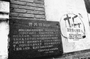2月16日,記者(注:人民日報記者)在天津民主道23號曹禺舊居院墻上看到,緊挨著天津市文物局和天津市河北區(qū)文物管理所等單位懸掛的兩塊曹禺舊居紀念牌的,是一個約60厘米高的墨寫的“拆”字(如圖),旁邊還張貼著花花綠綠的各類“搬家公司”的小廣告。旁邊有的住家已人去樓空,三三兩兩收破爛的外地人正在曹禺故居外來回轉悠。
