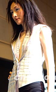 “2004香港教育及職業(yè)博覽會(huì)”二月十九日在香港會(huì)展中心開幕,圖為在香港職業(yè)訓(xùn)練局工商信息學(xué)院展臺(tái)上,模特展示該院學(xué)生創(chuàng)作的服飾作品。作者:錢興強(qiáng)