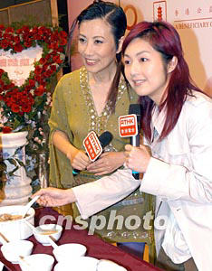 藝人汪明荃2月25日在香港電臺(tái)出席由香港電臺(tái)及香港防癌會(huì)合辦的《汪明荃愛(ài)心演唱會(huì)》記者會(huì),歌星楊千嬅特別送上補(bǔ)湯向“阿姐”汪明荃打氣。