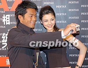 圖:古天樂簽約數(shù)碼相機(jī)代言人與模特試用自拍