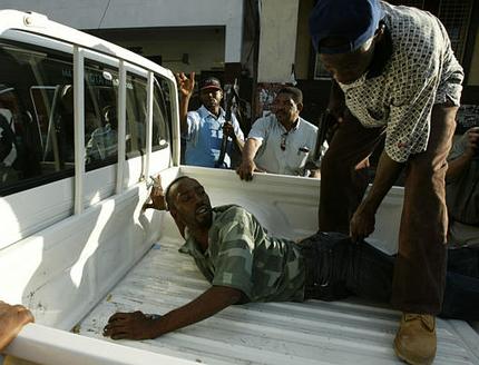 中新網(wǎng)3月1日電 據(jù)美聯(lián)社報道,海地總統(tǒng)阿里斯蒂德流亡海外后,海地局勢并未平息下來。在首都太子港,打、砸、搶事件頻頻發(fā)生。圖為自稱是“叛軍”的武裝分子抓獲了一名被懷疑是阿里斯蒂德支持者的海地人。