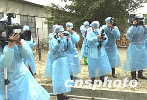 澳門特區(qū)民政總署和珠海出入境檢驗檢疫局一日在珠海舉行會議,就恢復因禽流感而中斷的活雞輸入問題進行協(xié)商并達成共識,雙方?jīng)Q定報國家有關部門批準后,從三月五日起同步恢復活雞、冰鮮雞、和凍雞的供應。圖為前往珠海養(yǎng)雞場采訪的眾媒體記者們?yōu)榇_保雞只的健康,也不得不穿上隔離防護服工作。作者:李剛