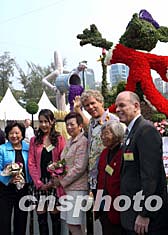 3月5日,出席“2004年香港花卉展”的民政事務(wù)局常任秘書長李麗娟、香港旅游發(fā)展局主席周梁淑怡議員等嘉賓,在香港迪斯尼樂園設(shè)計的花壇攤位留影。作者:洪少葵