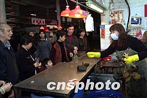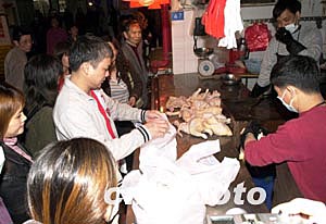 內(nèi)地五日開始為澳門恢復(fù)活雞供應(yīng)受到澳門市民的歡迎,經(jīng)澳門衛(wèi)生檢疫部門檢驗(yàn)后雞只下午開始在街市銷售,聞?dòng)嵑蟮氖忻窦娂姷绞袌?chǎng)排隊(duì)購買,僅一個(gè)多小時(shí),在佑漢街市銷售的四百五十多只活雞就基本售磬。作者:李剛