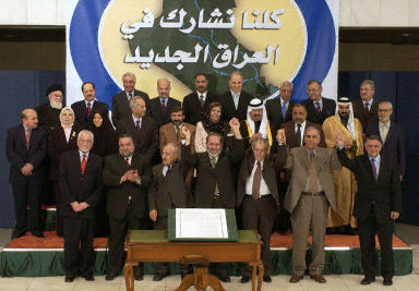 伊拉克臨時管理委員會最后一名成員在伊拉克臨時憲法上簽字后展示憲法文本。