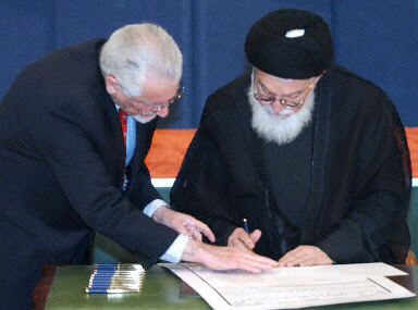伊拉克臨時管理委員會本月輪值主席烏魯姆(右)在伊拉克臨時憲法上簽字。