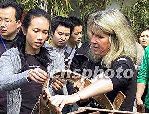 三月十二日,香港明星莫文蔚來(lái)到成都龍橋黑熊救護(hù)中心,捐款三萬(wàn)八千三百八十八港元并出任首位“拯救黑熊愛(ài)心大使”。亞洲動(dòng)物基金會(huì)的創(chuàng)辦人謝羅使臣女士給莫文蔚介紹養(yǎng)熊場(chǎng)的工具。作者:魯彥
