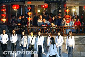 三月十三日晚,參加“古鎮(zhèn)西塘”2004年國際旅游小姐大賽中國區(qū)總決賽的三十二名參賽佳麗在西塘古鎮(zhèn)新搭建的水上舞臺排練,吸引了不少觀眾觀看。中新社記者:盛佳鵬