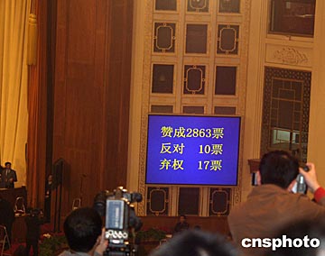 十屆全國人大二次會議下午舉行閉幕會,與會代表以投票表決的方式通過憲法修正案。二千八百九十張有效票中,贊成二千八百六十三票、反對十票、棄權十七票,憲法修正案獲得通過。