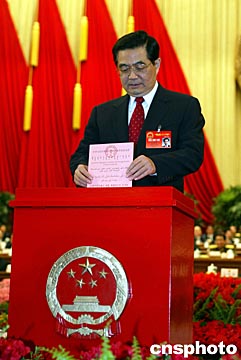 十屆全國(guó)人大二次會(huì)議三月十四日在北京人民大會(huì)堂舉行閉幕式,中共中央總書(shū)記、國(guó)家主席胡錦濤投票表決“憲法修正案草案”。中新社記者:毛建軍