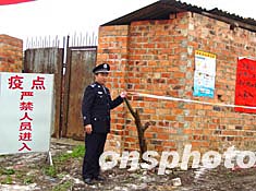 閉家紅、李志基夫婦牽著年幼的兒子,今天上午十時(shí)滿臉笑容走出了警方設(shè)置的警戒線,三十九天來,他們一家和其他六戶養(yǎng)殖戶二十二人一直被隔離在廣西南寧市興寧區(qū)北湖園藝場(chǎng)的一個(gè)小山丘上,因?yàn)樵谒麄兙幼〉倪@個(gè)山丘上發(fā)生了高致病性禽流感疫情。