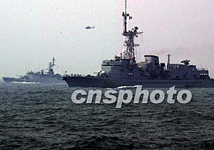 三月十六日,在青島進(jìn)行的中法聯(lián)合軍事演習(xí)中,中國海軍112驅(qū)逐艦上直升機(jī)正在迅速起飛。中新社記者:宋吉河