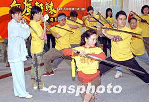 古裝武俠劇《血薦軒轅》劇中眾藝員3月17日在香港齊集李暉武術(shù)文化中心,邀請武術(shù)名師李暉小姐教授舞刀劍耍太極,為感謝李暉親自指導(dǎo),“阿姐”汪明荃代表無線電視向她贈(zèng)送印有「武術(shù)超群」牌匾。作者:鄧慶樂