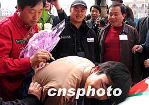 三月十八日,中國(guó)車(chē)王盧寧軍和他的“座騎”中國(guó)出產(chǎn)的帕拉丁汽車(chē)亮相蘭州,熱情的車(chē)迷請(qǐng)盧寧軍為在衣服上簽名。作者:劉呈軍