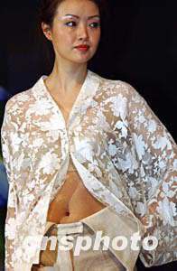 “2004香港國際春季時裝材料展”三月二十三日在香港會展中心開幕,參展設(shè)計師在展會上推出選用不同面料設(shè)計的時裝,簡潔、典雅。中新社傳真 錢興強 攝