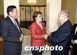 3月24日,香港行政長(zhǎng)官董建華在禮賓府與鳳凰衛(wèi)視主播劉海若(中)、鳳凰衛(wèi)視老板劉長(zhǎng)樂(左)會(huì)面。劉海若02年5月在倫敦火車意外嚴(yán)重受傷,在北京接受治療后康復(fù)返港。作者:中新社