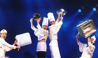 三個(gè)些許瘋狂的"廚師"和略帶頑皮的助手正準(zhǔn)備開始一天的工作,搬蔬菜,挪凍肉,整理廚具……主管突然宣布要完成一場(chǎng)盛大的婚宴,在下午6點(diǎn)之前要作完訂單上的菜,還介紹他不懂料理技術(shù)的侄子來幫忙,可是時(shí)間非常緊迫,在這樣令人窒息又緊張的時(shí)刻,總管當(dāng)然希望所有的準(zhǔn)備工作都能按部就班地照章完成。但是幾個(gè)廚師卻如何都統(tǒng)一不起來,又看不順眼總管的侄子,相互敲擊的混亂場(chǎng)面也就由此而生。在傳統(tǒng)表演中使用的打擊樂器被廚房中不同種類的日常廚具所代替,砰砰地敲擊出頗有韻律的節(jié)奏,伴隨著玩耍的歡呼,廚師們用詼諧幽默的肢體動(dòng)作,把一場(chǎng)烹飪工作演變成戲謔的惡作劇,卻帶給觀眾視覺的沖擊和聽覺的震撼,引得觀眾不由自主地想要參與其中。當(dāng)"廚師們"完成精美的菜肴,表演也進(jìn)而達(dá)到了極致。
