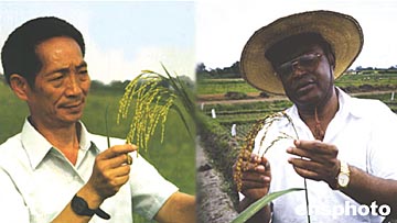 被稱為中國“雜交水稻之父”的袁隆平教授和來自塞拉利昂的瓊斯博士因在培育高產(chǎn)水稻方面的杰出貢獻(xiàn),29日在美國首都華盛頓被授予二00四年度“世界糧食獎”,兩人分享二十五萬美元的獎金。中新社圖